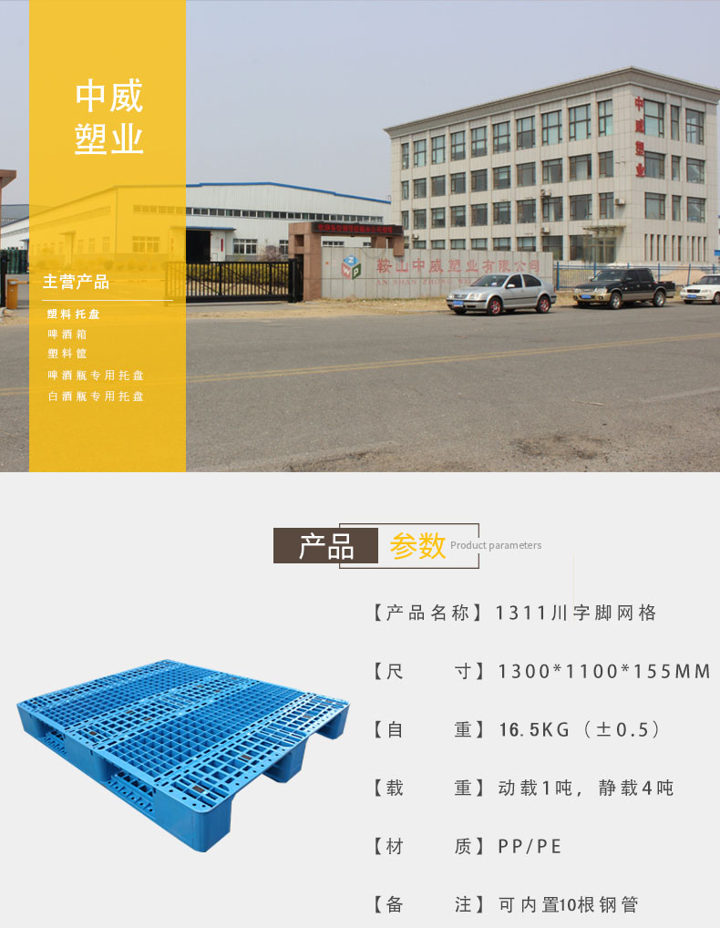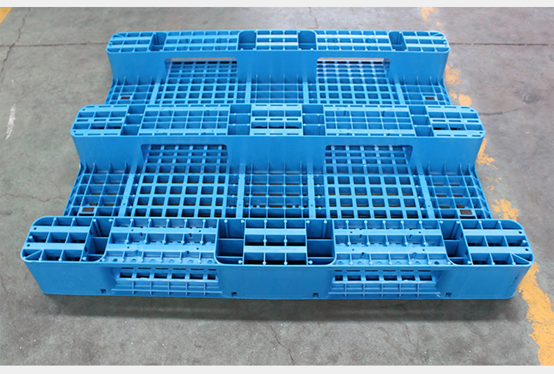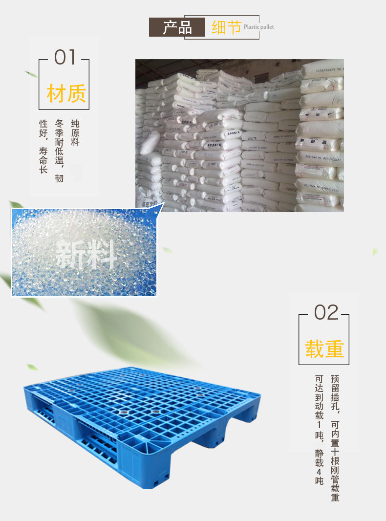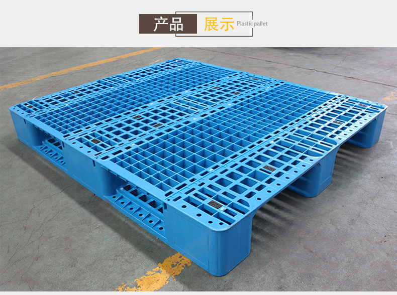 【尺寸】1300*1100*155mm 【自重】16.5kg(±0.5) 【載重】動(dòng)載1噸,靜載4噸 【材質(zhì)】PP/PE 【顏色】藍(lán)色 【鋼管】可內(nèi)置10根鋼管,加鋼管后動(dòng)載1噸,靜載4噸 【備注】川字網(wǎng)格塑料托盤能使用叉車周轉(zhuǎn)貨物,可以上貨架使用(上貨架時(shí),承載量根據(jù)貨架結(jié)構(gòu)而定,嚴(yán)禁超載使用)