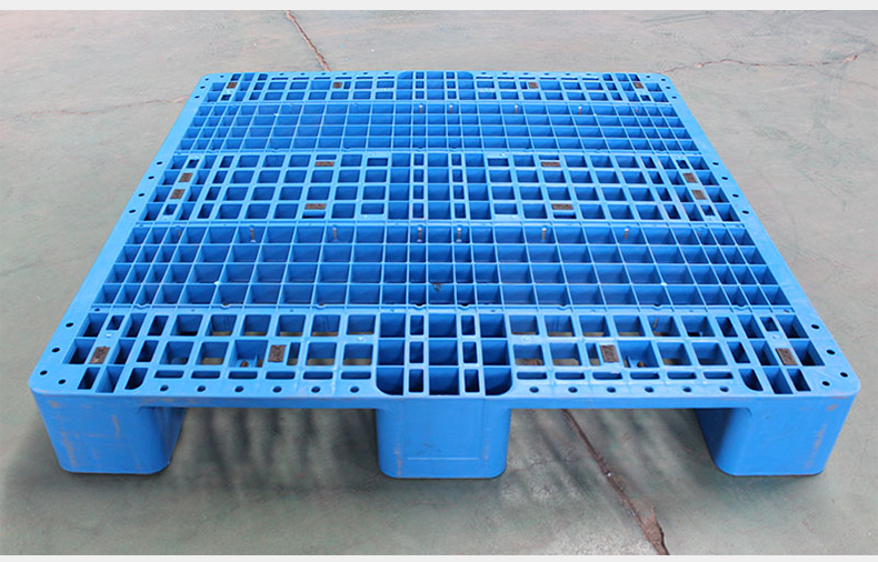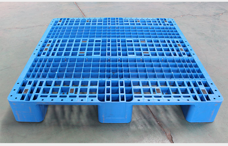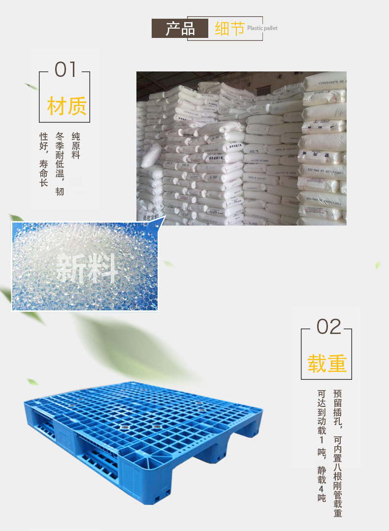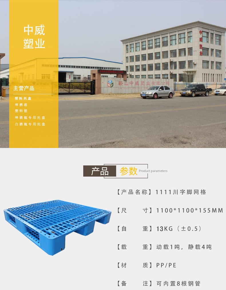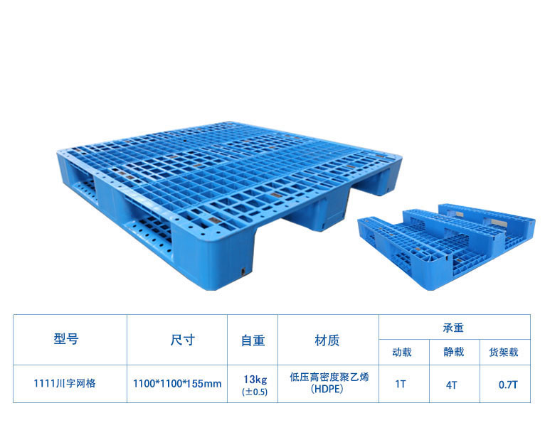 【尺寸】1100*1100*155mm 【自重】13kg(±0.5) 【載重】1噸,靜載4噸 【材質(zhì)】PP/PE 【顏色】藍(lán)色 【鋼管】可內(nèi)置8根鋼管,加鋼管后動載1噸,靜載4噸 【備注】川字網(wǎng)格塑料托盤能使用叉車周轉(zhuǎn)貨物,可以上貨架使用(上貨架時,承載量根據(jù)貨架結(jié)構(gòu)而定,嚴(yán)禁超載使用)